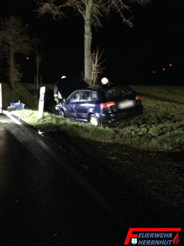 | Beschreibung: Gemeinsam mit mehreren anderen Wehren wurden wir zu einem Verkehrsunfall kurz vor Bernstadt alarmiert. Dort war ein PKW frontal gegen einen Baum geprallt. Die technische Rettung führten die Feuerwehren aus Altbernsdorf und Bernstadt durch. Wir sperrten die Straße in Richtung Großhennersdorf ab und stellten die Löschbereitschaft her. |