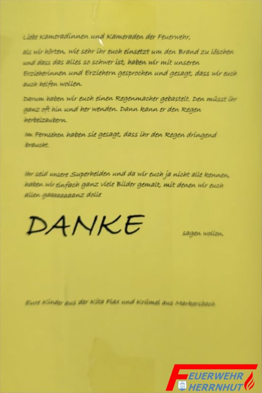 Freitag wurde dann das Löschfahrzeug aus Sagar durch eines aus Niesky ersetzt. Die restlichen Tage verbrachte der Zug dann mit Brandbekämpfung, dem Suchen von Glutnestern und der Ablöschung dieser sowie wieder dem ziehen von Brandschneisen und der Flutung dieser mit Netzwasser.